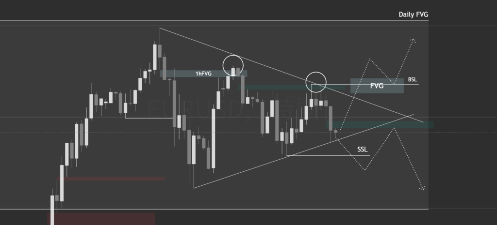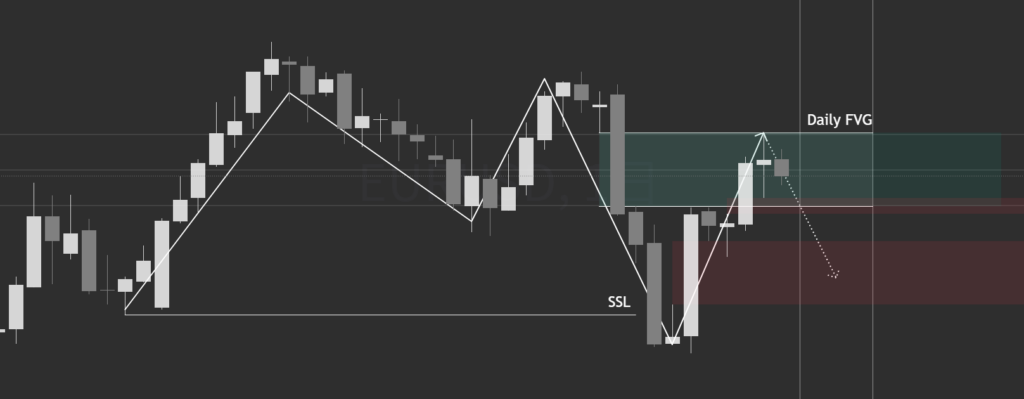 ユーロドルもまず日足レベルで見てみると最高値の起点となった安値のSSLをスイープしトレンド転換の含みを持たせた後、大きく上昇し押し目候補のFVGに突入。その中で十字線のような上下にひげが長いローソク足を形成した。