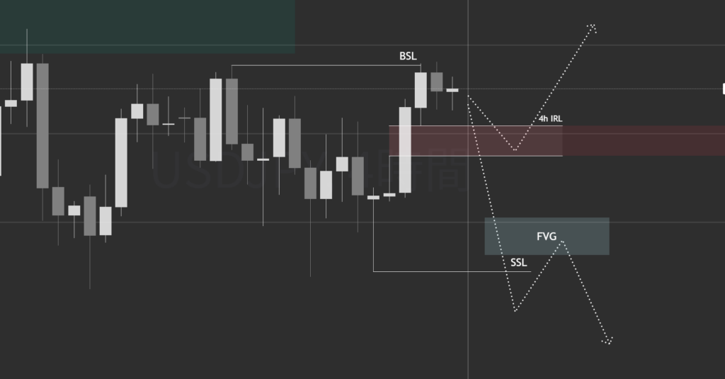 4時間足でみるとレンジで動きつつも、直近ではFVGを作りながら目立つBSL(BuySideLiquidity)をスイープしてジリ下げ。